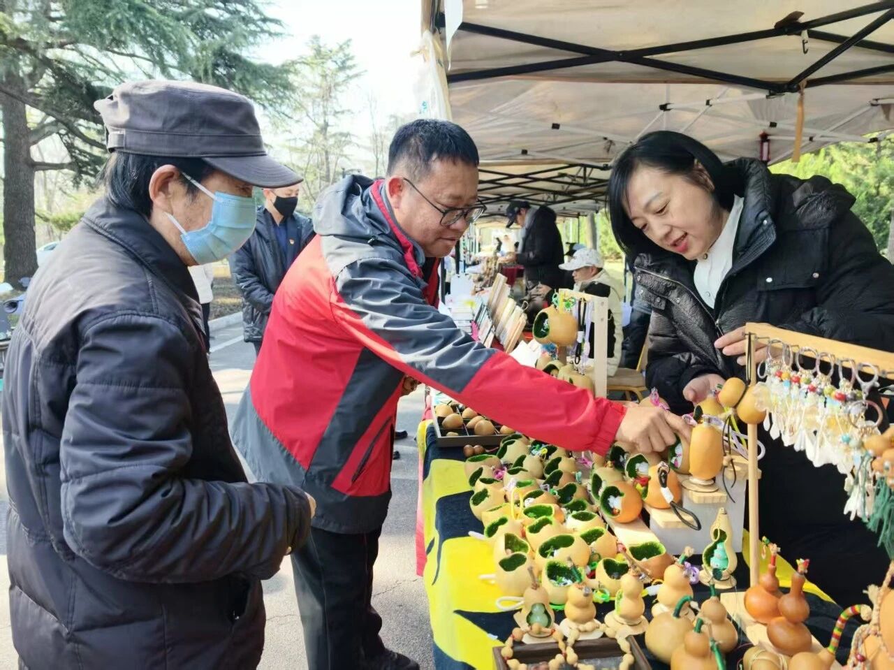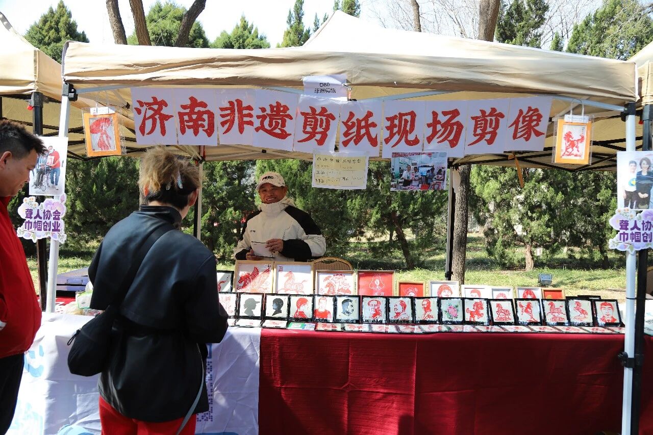 “助农手作区”融合了第一书记直供农产品与残障手工艺人非遗创作,实现助农帮扶与文化传承双效合一。在济南聋人协会巾帼创业摊位上,一幅幅精美的工艺画框、一个个造型别致的手造葫芦灯、色彩斑斓的非遗扎染作品静静陈列。身穿红马甲的南郊青年志愿者们有的充当“销售员”,通过手写板、手势与听障商户进行沟通,向游客热情推介;有的化身“安全员”,帮助商户做好用火、用电、用气的安全排查,确保活动安全有序进行。南郊宾馆办公楼党支部和会议服务党支部的党员们深入经营一线,为残障人士提供志愿服务,发挥了党支部战斗堡垒作用和党员的先锋模范作用。一位购买了剪纸作品的市民感慨:“这不仅是一件艺术品,更是一份有意义的公益支持。”