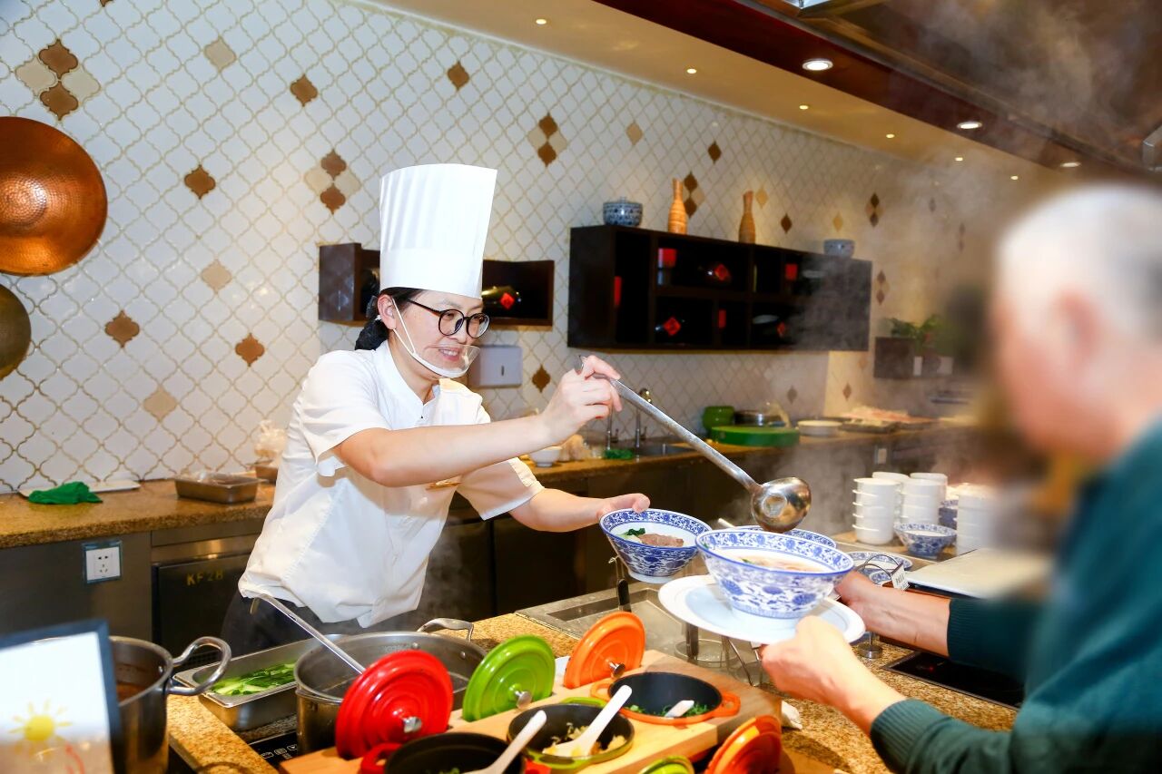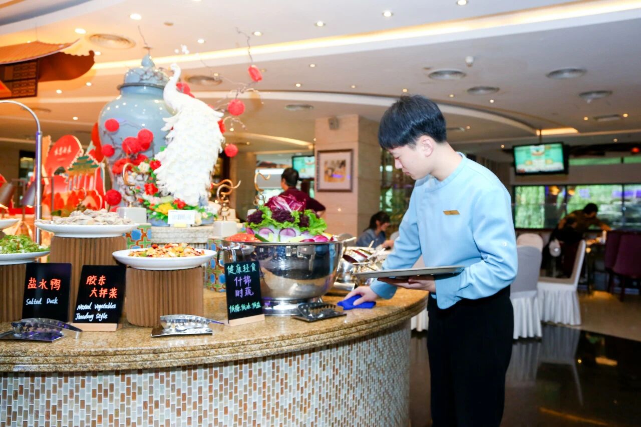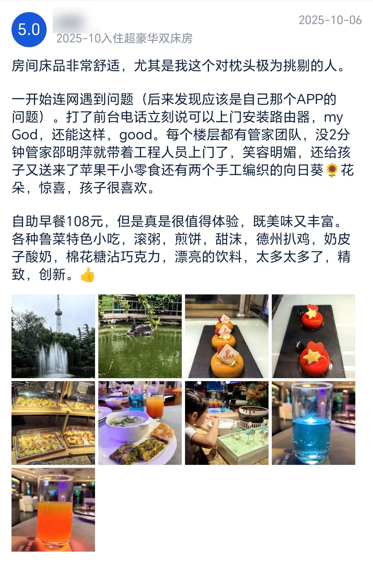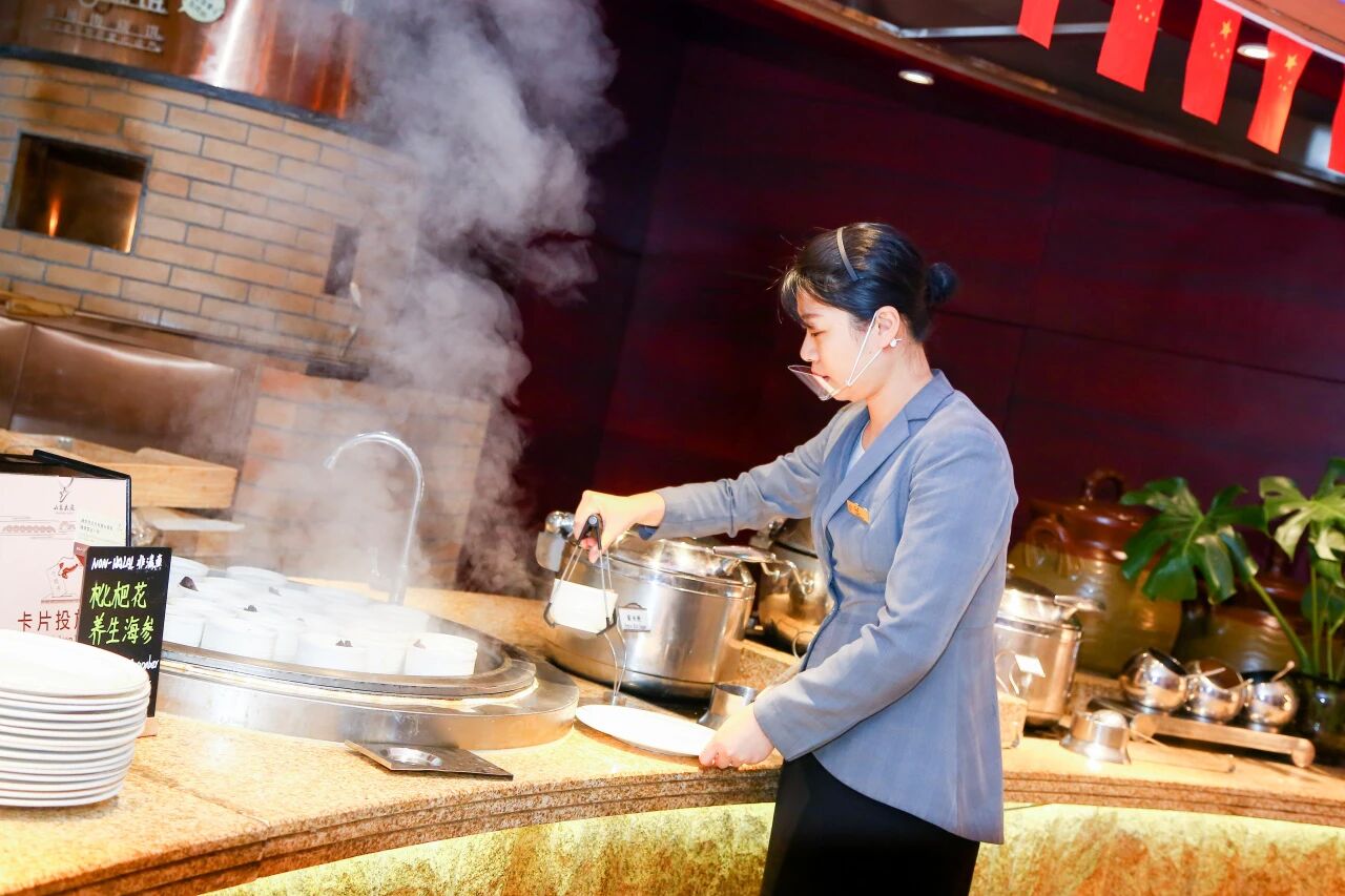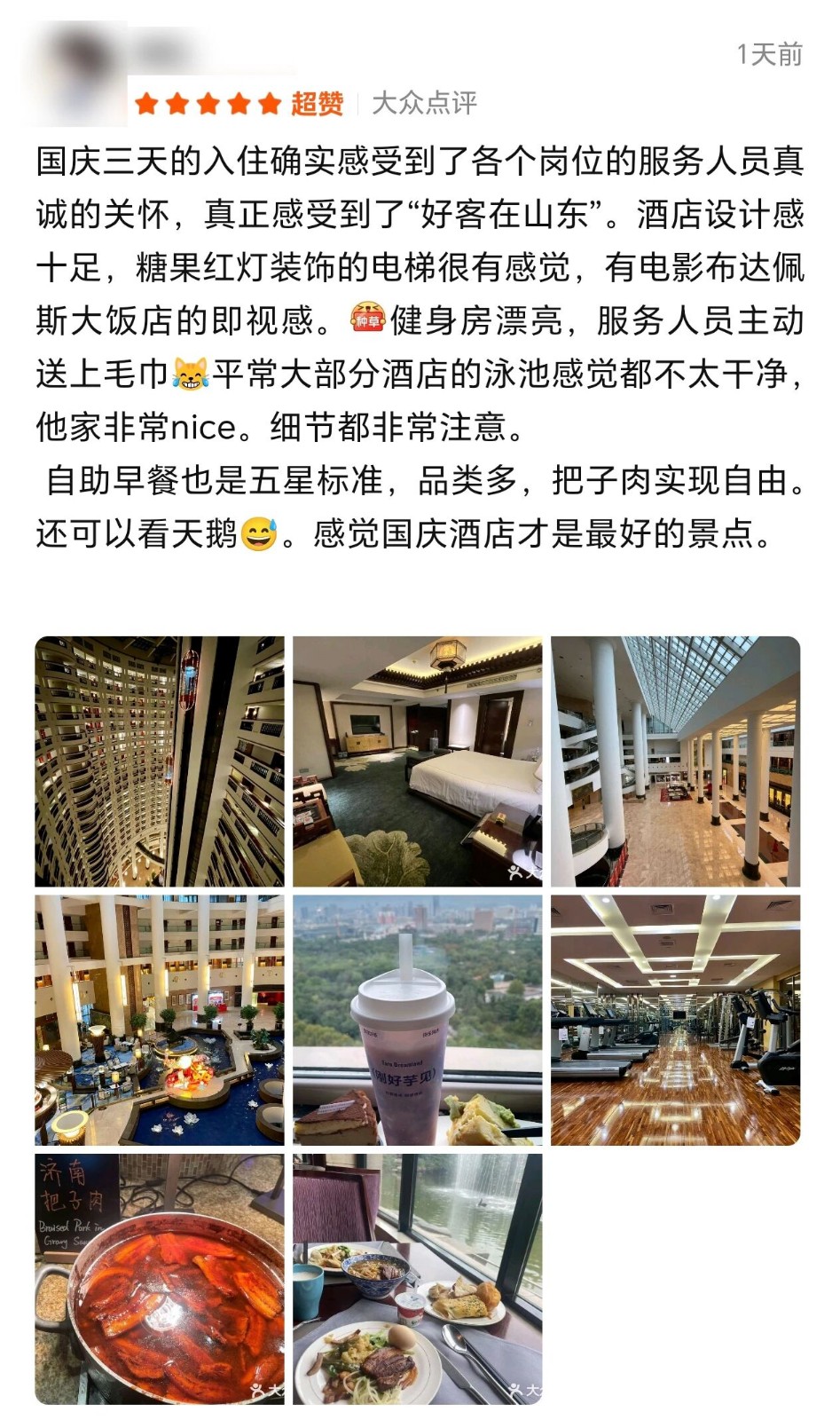 客房精心打造的“盛世华诞”主题客房,搭配定制国庆礼赠,全新开放的免费洗衣房更为住店宾客提供了便捷服务,让宾客在窗明几净的温馨空间中尽享佳节喜悦。餐饮板块同样表现抢眼,齐鲁风味特色菜品与环球美食自助餐备受追捧,餐中一座难求。每日精心准备的特色个吃更成为用餐环节的点睛之笔,以实力诠释“舌尖上的流量担当”。