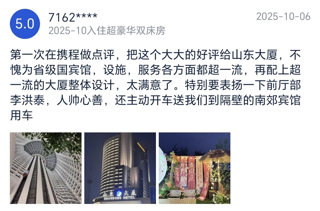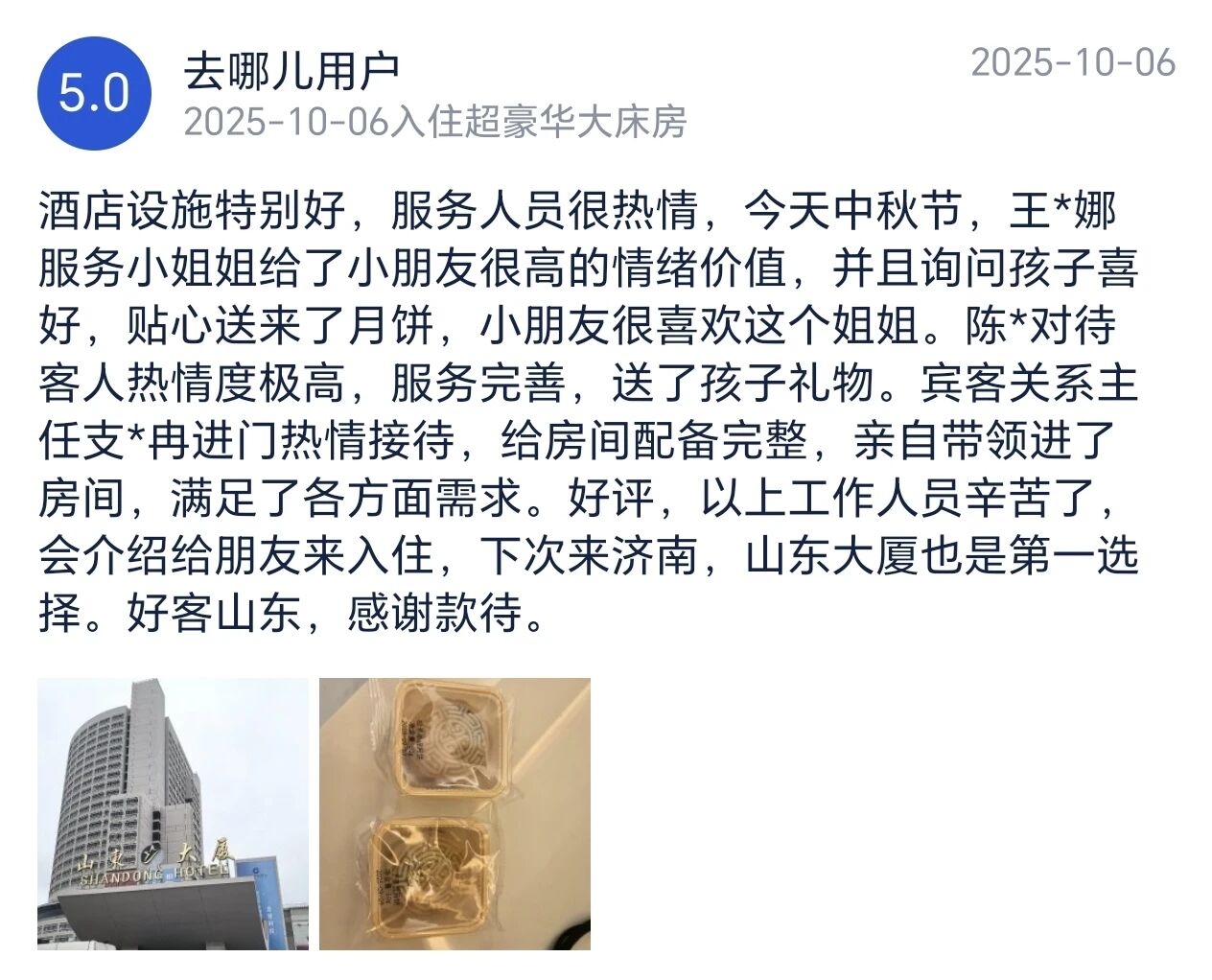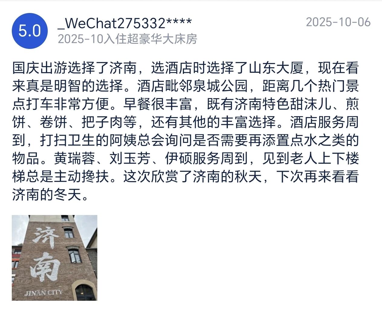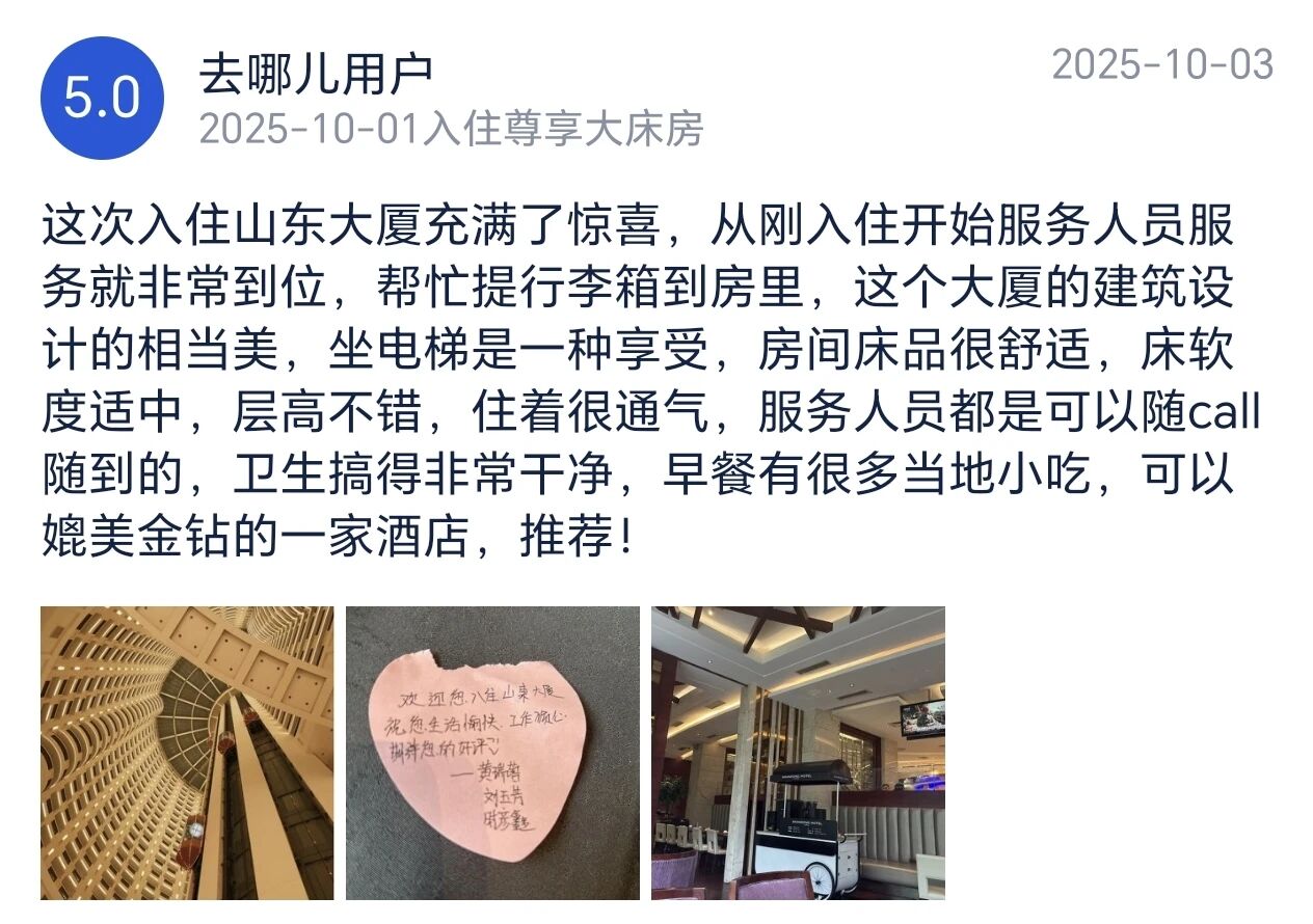 金桂飘香,一轮明月寄深情;盛世华诞,万里河山披锦绣。当国庆的红旗漫卷齐鲁大地,山东大厦全体干部员工坚守岗位,以饱满的热情、优质暖心的服务、高度的责任感和使命感,全力为每一位宾客提供舒适、安全、高品质的旅居体验,用实际行动诠释了“阳光微笑暖人,LOVE服务暖心”的服务理念,为节日增添了一抹亮丽的“山东色彩”。